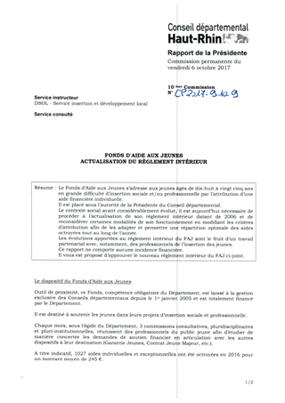 Le Fonds d’Aide aux Jeunes s’adresse aux jeunes âgés de dix-huit à vingt cinq ans en grande difficulté d’insertion sociale et/ou professionnelle par l’attribution d’une aide financière individuelle. Il est placé sous l’autorité de la Présidente du Conseil départemental. Le contexte social ayant considérablement évolué, il est aujourd’hui nécessaire de procéder à l’actualisation de son règlement intérieur datant de 2006 et de reconsidérer certaines modalités de son fonctionnement en modifiant les critères d’attribution afin de les adapter et permettre une répartition optimale des aides octroyées tout au long de l’année. Les évolutions apportées au règlement intérieur du FAJ sont le fruit d’un travail partenarial avec, notamment, des professionnels de l’insertion des jeunes. Ce rapport ne comporte aucune incidence financière. Il vous est proposé d’approuver le nouveau règlement intérieur du FAJ ci-joint.