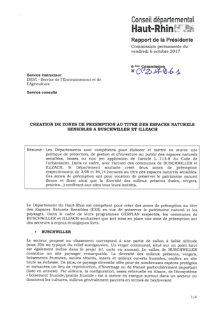 Les Départements sont compétents pour élaborer et mettre en œuvre une politique de protection, de gestion et d’ouverture au public des espaces naturels sensibles, boisés ou non (en application de l'article L 113-8 du Code de l'urbanisme). Dans ce cadre, avec l’accord des communes de BUSCHWILLER et ILLZACH, le Département souhaite créer deux zones de préemption respectivement de 3,98 et 44,14 hectares au titre des espaces naturels sensibles. Ces zones de préemption ont pour vocation de préserver le patrimoine naturel (faune et flore) ainsi que la diversité des milieux présents (haies, vergers, prairies…) conférant aux sites tous leurs intérêts.