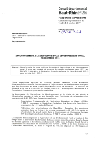 Dans le cadre de notre politique de soutien à l’agriculture et au développement rural, il vous est proposé de soutenir les actions envisagées pour 2017 par l’OPABA (9 000 €) et la Fédération des arboriculteurs du Haut-Rhin (12 505 €) pour un total de 21 505 €.