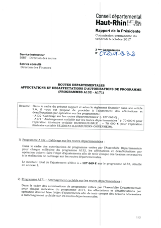 Dans le cadre du présent rapport et selon le règlement financier dans son article 9.6, il vous est proposé de procéder à l’ajustement des affectations et désaffectations par opération sur les programmes : - A132 "Calibrage sur les routes départementales" (- 127 669 €) ; - A171 " Aménagement cyclable sur les routes départementales " (- 70 000 € pour l’opération itinéraire cyclable HUNINGUE-BALE ; + 70 000 € pour l’opération itinéraire cyclable SELESTAT-ILLHAEUSERN-OHNENHEIM).