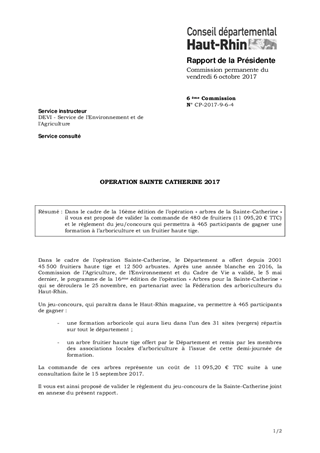 Dans le cadre de la 16ème édition de l’opération « arbres de la Sainte-Catherine » il vous est proposé de valider la commande de 480 de fruitiers (11 095,20 € TTC) et le règlement du jeu/concours qui permettra à 465 participants de gagner une formation à l’arboriculture et un fruitier haute tige.