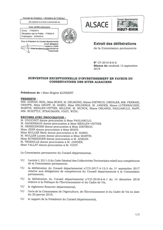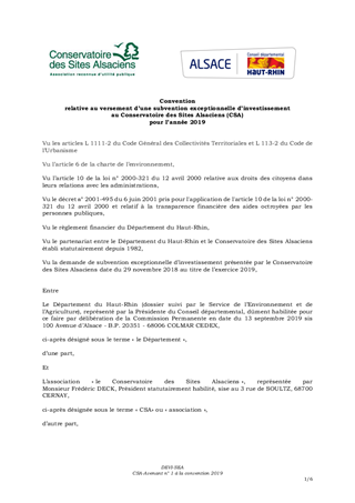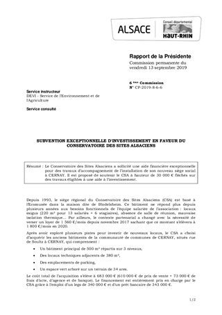 Le Conservatoire des Sites Alsaciens a sollicité une aide financière exceptionnelle pour des travaux d’accompagnement de l’installation de son nouveau siège social à CERNAY. Il est proposé de soutenir le CSA à hauteur de 30 000 € fléchés sur des travaux éligibles à une aide à l’investissement.