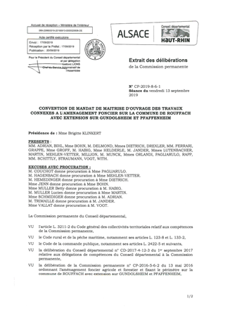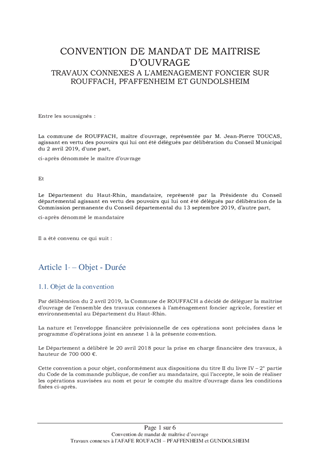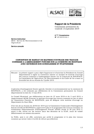 Le présent rapport a pour objet d’approuver et d’autoriser la Présidente du Conseil départemental à signer la convention relative au mandat de maîtrise d’ouvrage des travaux connexes à l’aménagement foncier sur la Commune de ROUFFACH. La Commission de l'Agriculture, de l'Environnement et du Cadre de Vie a émis un favorable lors de sa réunion du 5 juillet 2019.