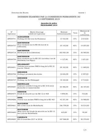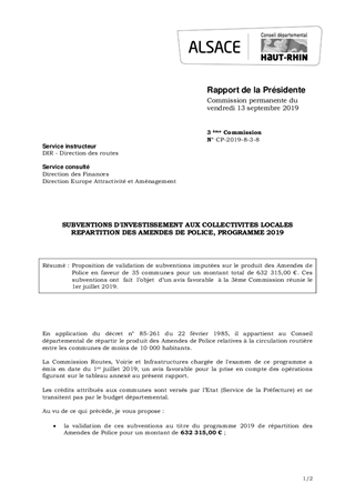 Proposition de validation de subventions imputées sur le produit des Amendes de Police en faveur de 35 communes pour un montant total de 632 315,00 €. Ces subventions ont fait l’objet d’un avis favorable à la 3ème Commission réunie le 1er juillet 2019.