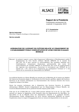 Le présent rapport a pour objet d’approuver l’affectation à l’Etablissement public d'exploitation du livre foncier d'Alsace Moselle (EPELFI) de la somme de 469 593, 90 € pour assurer le renouvellement des systèmes exploités par l’établissement comprenant l’évaluation prévisionnelle des coûts de renouvellement du système AMALFI et l’évaluation des coûts de modernisation des registres des associations, d’autoriser le reversement par l’EPELFI de la somme de 1 341 316,71 € et d’approuver en conséquence l’avenant n° 2 de clôture de la convention de financement de l’EPELFI.
