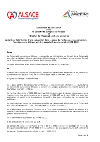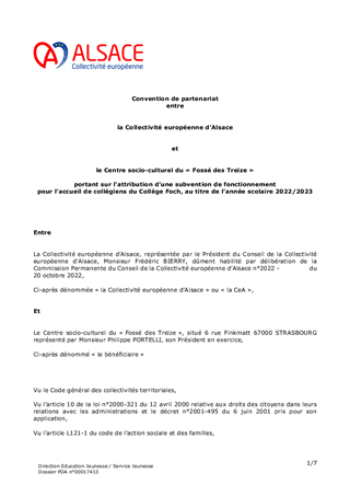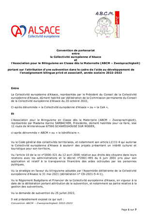 Compte tenu de la création d'une nouvelle amicale du personnel le 27 septembre 2022, dénommée l’ « Amicalsace », née de la fusion-création des deux anciennes associations bas-rhinoise et haut-rhinoise, il convient de conclure, pour le reste de l’année 2022, une première convention de partenariat entre la Collectivité européenne d'Alsace et l’Amicalsace. Il vous est proposé d’attribuer à l’Amicalsace, une subvention de fonctionnement 2022 d’un montant de 207 500 euros afin de lui permettre de fonctionner le reste de cette année.