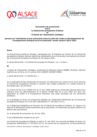 La politique éducative de la Collectivité européenne d’Alsace joue un rôle fondamental de socialisation et d'ouverture sur le monde des jeunes alsaciens. Elle finance le fonctionnement des collèges publics et privés et attribue des subventions pour les voyages et sorties scolaires organisés par les collèges et écoles publics et privés du Bas-Rhin et du Haut-Rhin. Au 19 septembre 2022, des subventions de fonctionnement ont été attribuées à hauteur de 159 643 € dans le cadre des voyages et sorties scolaires vers les lieux de mémoire alsaciens des collèges publics et privés du Bas-Rhin (9 435 élèves – 124 sorties et voyages scolaires) et 116 270 € dans le cadre de sorties scolaires avec nuitées pour les collèges et les écoles publics et privés du Haut-Rhin (3 115 élèves – 71 sorties scolaires avec nuitées). Ce rapport propose l’attribution de subventions de fonctionnement pour un montant total de 42 848 € dans le cadres de voyages et sorties scolaires vers les lieux de mémoire alsaciens des collèges publics du Bas-Rhin (2041 élèves - 21 sorties et voyages scolaires) et des sorties scolaires avec nuitées pour les collèges et les écoles publics et privés du Haut-Rhin (852 élèves – 17 sorties scolaires avec nuitées).