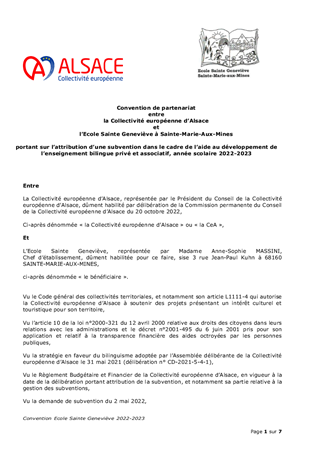 Dans le prolongement des actions menées depuis 2006 au sein du Cercle de Yanfolila au Mali, il vous est proposé de poursuivre le partenariat entre la Collectivité européenne d'Alsace et la région de Yanfolila au Mali. Ce programme vise à accompagner le développement durable et inclusif du territoire ainsi que le renforcement des capacités des acteurs locaux. Trois conventions sont soumises au vote : une convention cadre, une convention financière et une convention opérationnelle. La subvention de fonctionnement de notre Collectivité s'élèverait à 29 000 €/an, soit 58 000 € au titre du programme d'actions 2022-2023. Il vous est également proposé d'autoriser notre Collectivité à percevoir l'aide d'un montant total de 320 000 € (160 000 €/an) accordée par le Ministère de l'Europe et des Affaires étrangères, au titre de l'appel à projets généraliste pour les exercices 2022 et 2023, et de reverser ces sommes à GESCOD.