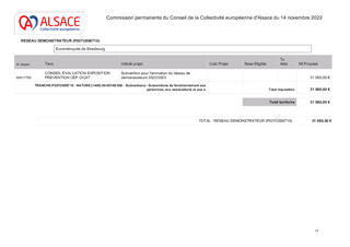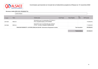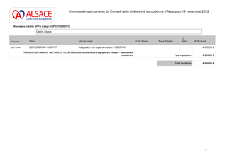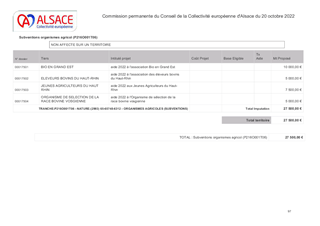 Dans le cadre de la programmation GERPLAN 2022, la Collectivité européenne d’Alsace est sollicitée pour la mise en œuvre de dix neuf projets relevant des domaines de l’environnement, de l’agriculture, de l’alimentation, du paysage et de la sensibilisation au cadre de vie. Il vous est proposé de soutenir ces projets pour un montant total de subvention de 70 440 € (dont 68 815 € en investissement et 1 625 € en fonctionnement).