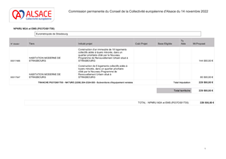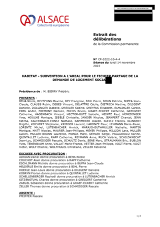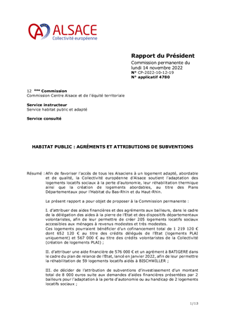 Afin de favoriser l'accès de tous les Alsaciens à un logement adapté, abordable et de qualité, la Collectivité européenne d'Alsace soutient l'adaptation des logements locatifs sociaux à la perte d'autonomie, leur réhabilitation thermique ainsi que la création de logements abordables, au titre des Plans Départementaux pour l'Habitat du Bas-Rhin et du Haut-Rhin. Le présent rapport a pour objet de proposer à la Commission permanente : I. d’attribuer des aides financières et des agréments aux bailleurs, dans le cadre de la délégation des aides à la pierre de l’Etat et des dispositifs départementaux volontaristes, afin de leur permettre de créer 205 logements locatifs sociaux accessibles aux ménages à revenus modestes et très modestes. Ces logements pourraient bénéficier d’un cofinancement total de 1 219 120 € dont 652 120 € au titre des crédits délégués de l’Etat (logements PLAI uniquement) et 567 000 € au titre des crédits volontaristes de la Collectivité (création de logements PLAI) ; II. d’attribuer une aide financière de 576 000 € et un agrément à BATIGERE dans le cadre du plan de relance de l'Etat, lancé en janvier 2022, afin de leur permettre la réhabilitation de 59 logements locatifs aidés à BISCHWILLER ; III. de décider de l’attribution de subventions d’investissement d’un montant total de 8 000 euros suite aux demandes d’aides financières présentées par 2 bailleurs pour l'adaptation à la perte d'autonomie ou au handicap de 2 logements locatifs sociaux ; IV. de décider de l’attribution de subventions d’investissement d’un montant total de 229 500 euros suite aux demandes d’aides financières présentées par 1 bailleur pour la construction de 24 logements à loyer minoré, à destination de ménages à faibles revenus (logements dits PLAI - Prêt Locatif Aidé d’Intégration) dans le cadre du dispositif NPNRU ; V. d’attribuer une subvention de fonctionnement d'un montant de 31 000 € au CEP-CICAT pour l’animation du réseau de démonstrateurs « Innovation pour l’autonomie » ; VI. d’attribuer des aides financières pour un montant de 172 100 € au titre de la politique volontariste de la Collectivité européenne d'Alsace dans le cadre de convention de partenariat avec la Banque des territoires.