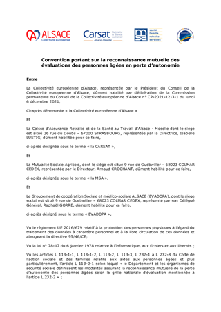 Initiée en 2020, le dispositif de reconnaissance mutuelle des évaluations des personnes âgées en perte d’autonomie vise à éviter les doubles évaluations à domicile, à réduire les démarches administratives, et à raccourcir les délais de réponse aux usagers. Après une phase d’expérimentation très positive, la présente convention vise à poursuivre le partenariat pour tous les Alsaciens retraités rattachés à la Caisse d’Assurance Retraite et de la Santé au Travail d’Alsace Moselle (CARSAT) et à élargir la démarche à ceux dépendant de la Mutualité Sociale Agricole (MSA).