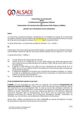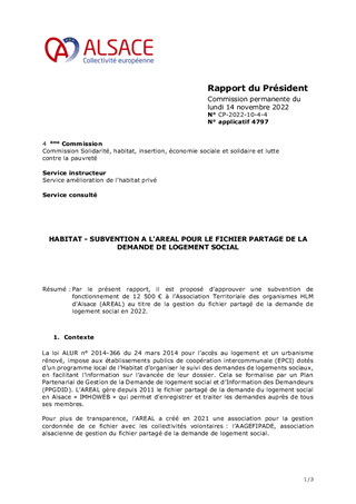 Par le présent rapport, il est proposé d’approuver une subvention de fonctionnement de 12 500 € à l’Association Territoriale des organismes HLM d’Alsace (AREAL) au titre de la gestion du fichier partagé de la demande de logement social en 2022.