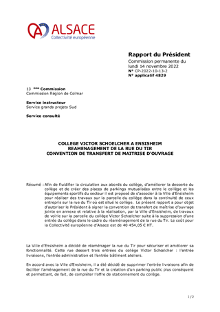 Afin de fluidifier la circulation aux abords du collège, d’améliorer la desserte du collège et de créer des places de parkings mutualisées entre le collège et les équipements sportifs du secteur il est proposé de s’associer à la Ville d’Ensisheim pour réaliser des travaux sur la parcelle du collège dans la continuité de ceux entrepris sur la rue du Tir où est situé le collège. Le présent rapport a pour objet d’autoriser le Président à signer la convention de transfert de maîtrise d’ouvrage jointe en annexe et relative à la réalisation, par la Ville d’Ensisheim, de travaux de voirie sur la parcelle du collège Victor Schœlcher suite à la suppression d’une entrée du collège dans le cadre du réaménagement de la rue du Tir. Le coût pour la Collectivité européenne d’Alsace est de 40 454,05 € HT.