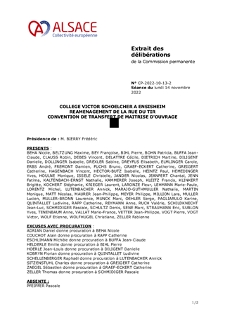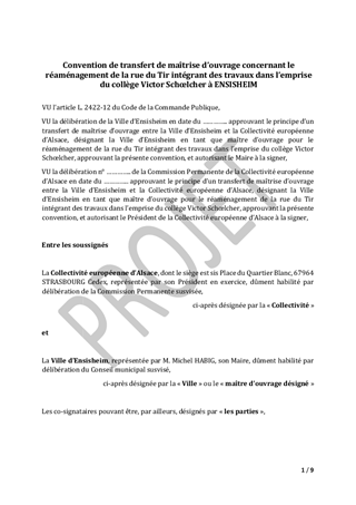 COLLEGE VICTOR SCHOELCHER A ENSISHEIM REAMENAGEMENT DE LA RUE DU TIR CONVENTION DE TRANSFERT DE MAITRISE D'OUVRAGE