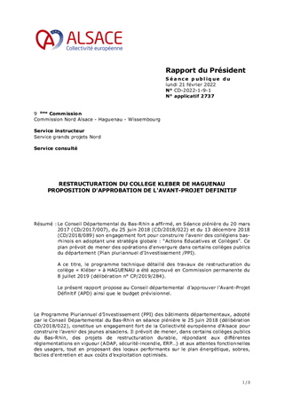 Le Conseil Départemental du Bas-Rhin a affirmé, en Séance plénière du 20 mars 2017 (CD/2017/007), du 25 juin 2018 (CD/2018/022) et du 13 décembre 2018 (CD/2018/089) son engagement fort pour construire l’avenir des collégiens bas-rhinois en adoptant une stratégie globale : "Actions Educatives et Collèges". Ce plan prévoit de mener des opérations d'envergure dans certains collèges publics du département (Plan pluriannuel d'Investissement /PPI). A ce titre, le programme technique détaillé des travaux de restructuration du collège « Kléber » à HAGUENAU a été approuvé en Commission permanente du 8 juillet 2019 (délibération n° CP/2019/284). Le présent rapport propose au Conseil départemental d’approuver l’Avant-Projet Définitif (APD) ainsi que le budget prévisionnel.