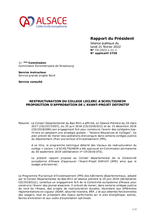 Le Conseil Départemental du Bas-Rhin a affirmé, en Séance Plénière du 20 mars 2017 (CD/2017/007), du 25 juin 2018 (CD/2018/022) et du 13 décembre 2018 (CD/2018/089) son engagement fort pour construire l’avenir des collégiens bas-rhinois en adoptant une stratégie globale : "Actions Educatives et Collèges". Ce plan prévoit de mener des opérations d'envergure dans certains collèges publics du département (Plan pluriannuel d'Investissement /PPI). A ce titre, le programme technique détaillé des travaux de restructuration du collège « Leclerc » à SCHILTIGHEIM a été approuvé en Commission permanente du 30 septembre 2019 (délibération n° CP/2019/373). Le présent rapport propose au Conseil départemental de la Collectivité européenne d’Alsace d’approuver l’Avant-Projet Définitif (APD) ainsi que le budget prévisionnel.