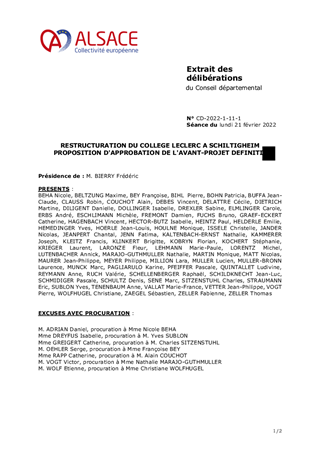 RESTRUCTURATION DU COLLEGE LECLERC A SCHILTIGHEIM PROPOSITION D'APPROBATION DE L'AVANT-PROJET DEFINITIF
