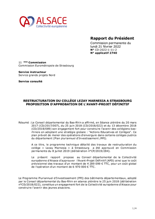 Le Conseil départemental du Bas-Rhin a affirmé, en Séance plénière du 20 mars 2017 (CD/2017/007), du 25 juin 2018 (CD/2018/022) et du 13 décembre 2018 (CD/2018/089) son engagement fort pour construire l’avenir des collégiens bas-rhinois en adoptant une stratégie globale : "Actions Educatives et Collèges". Ce plan prévoit de mener des opérations d'envergure dans certains collèges publics du département (Plan pluriannuel d'Investissement /PPI). A ce titre, le programme technique détaillé des travaux de restructuration du collège « Lezay Marnesia » à Strasbourg a été approuvé en Commission permanente du 8 juillet 2019 (délibération n°CP/2019/284). Le présent rapport propose au Conseil départemental de la Collectivité européenne d’Alsace d’approuver l’Avant-Projet Définitif (APD) ainsi que le coût prévisionnel des travaux d'un montant de 4 289 099 € TTC, pour un coût global de l'opération d'un montant de 6 970 000 € TTC.