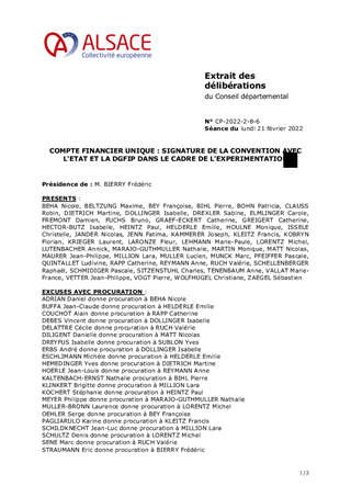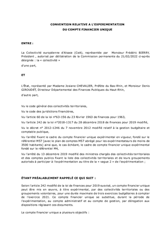 La Collectivité européenne d'Alsace a été retenue pour l’expérimentation du compte financier unique à partir de 2022 en lieu et place des comptes administratif et de gestion. La présente délibération autorise le Président à signer la convention entre la collectivité, l'Etat et la DGFiP