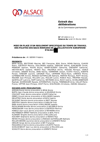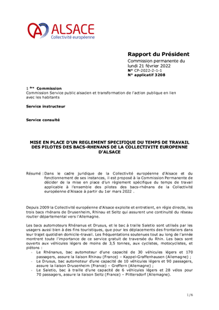Dans le cadre juridique de la Collectivité européenne d’Alsace et du fonctionnement de ses instances, il est proposé à la Commission Permanente de décider de la mise en place d’un règlement spécifique du temps de travail applicable à l’ensemble des pilotes des bacs-rhénans de la Collectivité européenne d’Alsace à partir du 1er mars 2022 .