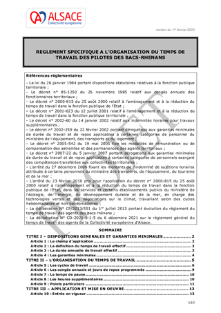 MISE EN PLACE D'UN REGLEMENT SPECIFIQUE DU TEMPS DE TRAVAIL DES PILOTES DES BACS-RHENANS DE LA COLLECTIVITE EUROPENNE D'ALSACE