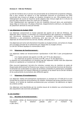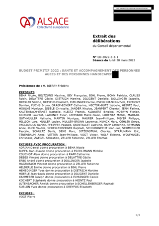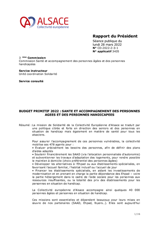 La Collectivité Européenne d’Alsace est née au 1er janvier 2021. Elle veut porter un service public moderne, qui combine les meilleures pratiques de chaque ancien Département. Une collectivité innovante c’est une collectivité qui se réinvente en conciliant la réponse aux attentes des habitants à la maitrise de la dépense publique. L’élaboration du budget est l’occasion de rappeler le sens que nous souhaitons donner à la transformation de l’action publique. Transformer l’action publique c’est repenser le modèle pour remettre l’Alsacien au cœur des décisions politiques : innover avec bon sens et pragmatisme, Remettre l’Alsacien au cœur des décisions : - Déployer les initiatives citoyennes - Identifier les difficultés quotidiennes des Alsaciens (difficultés économiques, sociales, administratives…) - Favoriser l’expression des idées des agents et des habitants Innover, avec la mise en place de nouveaux dispositifs : - La taxe poids lourds, qui permettra un rééquilibrage du trafic avec l’Allemagne, un financement des infrastructures. L’année 2022 permettra d’engager la concertation avec les acteurs professionnels et de lancer le dialogue compétitif pour la définition technique de la solution technique et son exploitation, pour identifier les distances parcourus par les poids lourds. - La contractualisation avec les territoires, qui sera déterminée pour juin, avec des principes de simplicité et de responsabilité des élus. - La mise en place de comités de citoyens et de testeurs, pour évaluer la simplicité, l’efficacité et la clarté de nos procédures. Innover en développant le potentiel des agents de la collectivité : - Valoriser les parcours (qualité de vie au travail, créer les conditions de réussite personnelle et collective, renforcement du sentiment d’appartenance à la collectivité) L’enjeu aujourd’hui c’est bien entendu d’inclure cette transformation dans les décisions budgétaires. Aucune dépense n’est possible sans que les représentants des citoyens n’aient voté une décision. Ce système c’est la traduction en chiffre du projet politique. En cette période de crises successives c’est justement de la capacité à faire une place à chaque alsacien que dépendra la réussite de la Collectivité Européenne d’Alsace. Il est ainsi proposé d’inscrire, au titre du Budget primitif 2022, au service de cette ambition, en dépense des crédits de paiement 333,9 M€ en fonctionnement et 105,5 M€ en investissement ainsi que 1,4 M€ d'autorisations d'engagement et de restituer 100,9 M€ d'autorisations de programme. En recettes, il est proposé d'inscrire 16,4 M€ de crédits de paiement en fonctionnement.