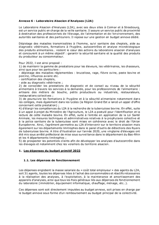 Créé au 1er janvier 2021 par la mutualisation des deux laboratoires départementaux bas-rhinois et haut-rhinois, le laboratoire alsacien d’analyses (L2A) développe, depuis plusieurs décennies, ses compétences aux services des éleveurs, des agriculteurs, des services de l’Etat et des industriels tout en leur proposant des tarifs acceptables au vu des difficultés rencontrées dans certaines professions agricoles ou avicoles. Le L2A effectue ses prestations et les tarifie selon des prix fixés dans un catalogue de prestations voté annuellement par la collectivité de rattachement. Les prestations sont réalisées suite à des devis ou conventions proposant le type d’analyses et leur coût aux futurs clients. Les conventions annuelles ou pluriannuelles doivent être revues au regard de la création de la Collectivité européenne d’Alsace. Il est donc proposé une révision des tarifs 2022 pour les prestations assurées sur les deux sites du L2A afin de proposer un seul catalogue à tous les clients. Il est également proposé au Conseil de la Collectivité d’approuver de nouvelles conventions liant son laboratoire d’analyses et d’autoriser son Président à les signer.