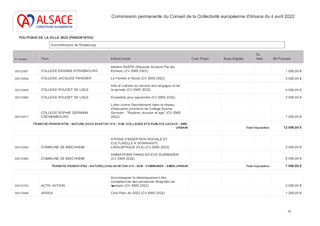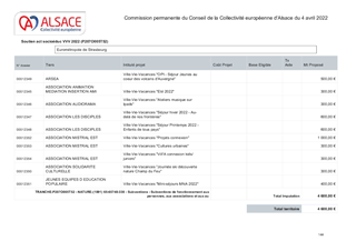 Conformément à la loi relative à la Ville et à la cohésion urbaine promulguée le 21 février 2014, le Département du Bas-Rhin a adopté lors de la réunion de son Assemblée Plénière du 6 juillet 2015 (CD/2015/84), le Contrat de Ville de l'Eurométropole de Strasbourg pour la période 2015-2020. Ce contrat a été conclu par le Département du Bas-Rhin et ses partenaires le 10 juillet 2015. La durée des Contrats de Ville a été prorogée de deux ans jusqu’en 2022 au titre de la Loi de Finances 2019, puis d'une année supplémentaire jusqu'en 2023 au titre de la Loi de finances 2022. Le présent rapport a pour objet de proposer à la Commission permanente de décider d’attribuer des subventions de fonctionnement pour un montant total de 268 670 € concernant les projets pour lesquels la Collectivité européenne d'Alsace a été sollicitée au titre du fonds de développement urbain, dans le cadre de l'appel à projets 2022 du Contrat de Ville de l’Eurométropole de Strasbourg.