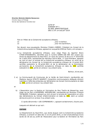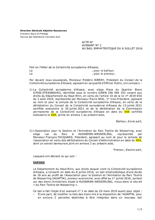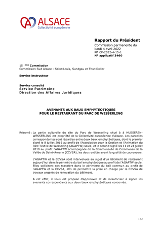 La partie culturelle du site du Parc de Wesserling situé à à HUSSEREN-WESSERLING est propriété de la Collectivité européenne d'Alsace. Les parcelles correspondantes sont réparties entre deux baux emphytéotiques, dont le premier signé le 8 juillet 2016 au profit de l’Association pour la Gestion et l'Animation du Parc Textile de Wesserling (AGAPTW) seule, et le second signé les 11 et 24 juillet 2019 au profit l’AGAPTW accompagnée de la Communauté de Communes de la Vallée de Saint-Amarin (CCVSA), les deux entités ayant la qualité de copreneurs. L'AGAPTW et la CCVSA sont intervenues au sujet d'un bâtiment de restaurant aujourd'hui dans le périmètre du bail emphytéotique au profit de l'AGAPTW seule. Elles sollicitent son transfert dans le périmètre du bail commun au profit de l'AGAPTW et la CCVSA, afin de permettre la prise en charge par la CCVSA de travaux urgents de rénovation du bâtiment. A cet effet, il vous est proposé d’approuver et de m’autoriser à signer les avenants correspondants aux deux baux emphytéotiques concernés.