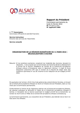 Si les conditions sanitaires, encadrant les modalités des réunions, devaient le nécessiter, il est proposé que la Commission permanente décide le déplacement à Colmar de la réunion budgétaire du Conseil de la Collectivité européenne d'Alsace prévue à Strasbourg, selon le règlement intérieur. Il s'agit là d'une disposition préventive afin que le Conseil ait la faculté de siéger dans des conditions optimales en vue de l'examen et de l'adoption de son budget primitif 2022.
