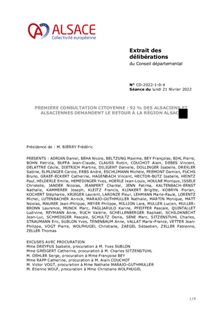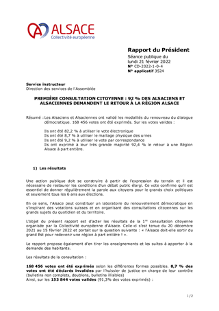 Les Alsaciens et Alsaciennes ont validé les modalités du renouveau du dialogue démocratique. 168 456 votes ont été exprimés. Sur les votes valides : Ils ont été 82,2 % à utiliser le vote électronique Ils ont été 8,7 % à utiliser le maillage physique des urnes Ils ont été 9,2 % à utiliser le vote par correspondance Ils ont exprimé à leur très grande majorité 92,4 % le retour à une Région Alsace à part entière.
