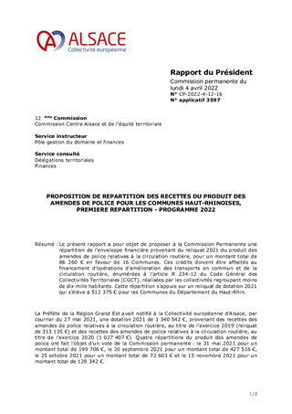 Le décalage du vote du budget primitif 2022 et par conséquent celui des décisions d'attribution des subventions risquent de fortement peser sur la trésorerie du Syndicat mixte des gardes-champêtres intercommunaux du Haut-Rhin, communément appelé « Brigade Verte ». Afin de ne pas mettre en difficulté cet organisme à un moment où celui-ci connaît un fort développement suite au déploiement entamé dans le Bas-Rhin, le présent rapport propose le versement d’une subvention au syndicat en exécution anticipée du budget. Le montant de la subvention proposé s’élève à 604 985 € au titre du fonctionnement, soit 40 % du montant attribué en 2021. Une subvention complémentaire pourra être soumise au vote de la Commission permanente postérieurement à l’adoption du budget primitif. Il vous est proposé de voter l'attribution de cette subvention et d'approuver la convention de financement correspondante. Il est également proposé qu’un prochain rapport sur les futurs statuts et la stratégie de déploiement de la Brigade Verte sur le territoire alsacien soit présenté au mois de juin 2022.