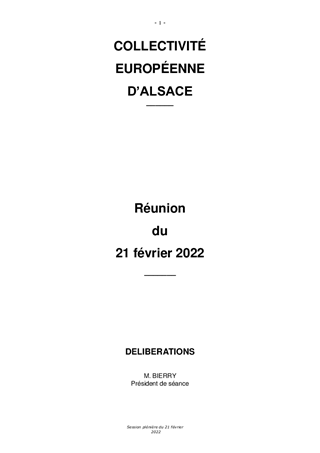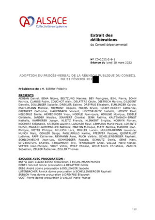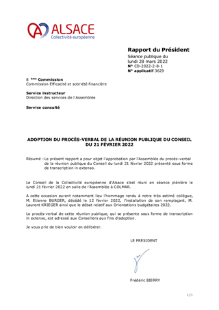 Le présent rapport a pour objet l'approbation par l'Assemblée du procès-verbal de la réunion publique du Conseil du lundi 21 février 2022 présenté sous forme de transcription in extenso.