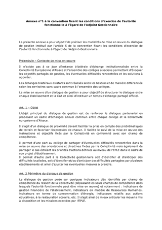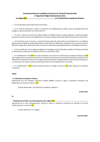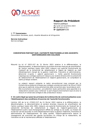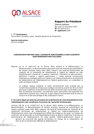 La loi n° 2022-217 du 21 février 2022 relative à la différenciation, la décentralisation, la déconcentration et portant diverses mesures de simplification de l’action publique locale (dite 3DS) instaure une autorité fonctionnelle de l'exécutif de la collectivité de rattachement à l’égard de l’adjoint au chef d’établissement chargé de la gestion matérielle, financière et administrative, dénommé ci-après « adjoint gestionnaire ». Cette autorité fonctionnelle s’applique aux collèges publics et instaure une relation directe entre la collectivité de rattachement de l’établissement et l’adjoint gestionnaire, en complétant le cadre juridique existant. Le présent rapport présente le cadre conventionnel type proposé par la Collectivité européenne d'Alsace aux collèges volontaires à partir du 30 avril 2024 ainsi que le cadre de renouvellement de cette convention pour les années à venir. Dès la prochaine convention, une attention toute particulière sera apportée à la restauration scolaire pour renforcer la part d’approvisionnement local et ainsi le recours en direct des collèges à des producteurs locaux.