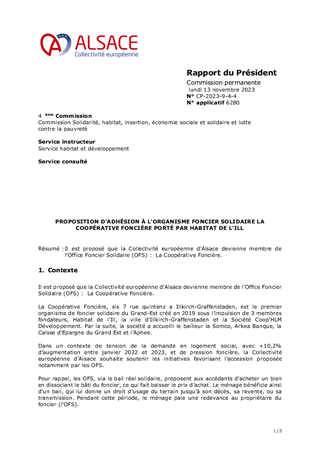 Il est proposé que la Collectivité européenne d’Alsace devienne membre de l’Office Foncier Solidaire (OFS) : La Coopérative Foncière.