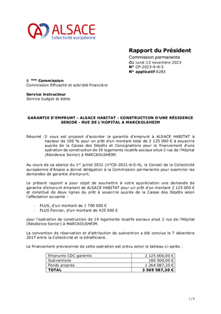 Il vous est proposé d’accorder la garantie d'emprunt à ALSACE HABITAT à hauteur de 100 % pour un prêt d’un montant total de 2 125 000 € à souscrire auprès de la Caisse des Dépôts et Consignations pour le financement d'une opération de construction de 19 logements locatifs sociaux situé 2 rue de l’Hôpital (Résidence Senior) à MARCKOLSHEIM.