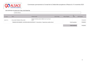 La Collectivité européenne d’Alsace, dans le cadre de sa politique éducative attribue des subventions pour les voyages et sorties scolaires organisés par les collèges et écoles publics et privés du Bas-Rhin et du Haut-Rhin. Le présent rapport a pour objet de proposer à la Commission permanente d’attribuer des subventions de fonctionnement pour un montant total de 47 260 € pour les voyages et sorties scolaires vers les lieux de mémoire alsaciens des collèges publics et privés du Bas-Rhin (1141 élèves - 21 sorties et voyages scolaires) et les sorties scolaires avec nuitées pour les écoles publiques et privées du Haut-Rhin (410 élèves – 8 sorties scolaires avec nuitées).