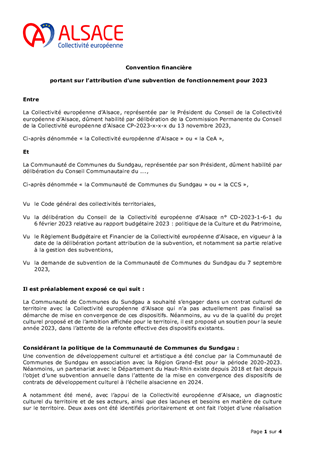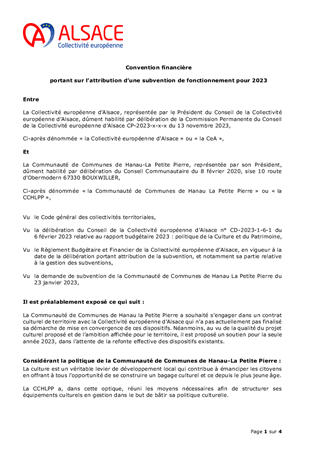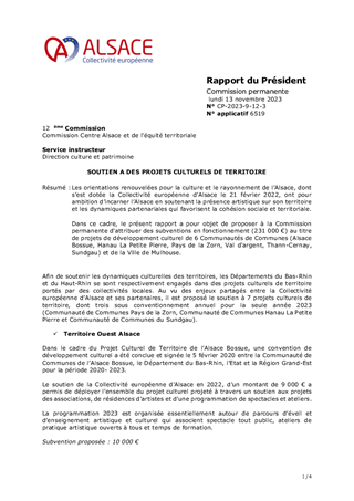 Les orientations renouvelées pour la culture et le rayonnement de l’Alsace, dont s’est dotée la Collectivité européenne d’Alsace le 21 février 2022, ont pour ambition d’incarner l’Alsace en soutenant la présence artistique sur son territoire et les dynamiques partenariales qui favorisent la cohésion sociale et territoriale. Dans ce cadre, le présent rapport a pour objet de proposer à la Commission permanente d'attribuer des subventions en fonctionnement (231 000 €) au titre de projets de développement culturel de 6 Communautés de Communes (Alsace Bossue, Hanau La Petite Pierre, Pays de la Zorn, Val d'argent, Thann-Cernay, Sundgau) et de la Ville de Mulhouse.