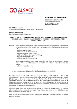 Par la présente délibération, il est proposé de signer les conventions d’opérations de revitalisation urbaine dans le cadre du programme « Petites Villes de demain » de : - la CC du Pays de Barr - la CC du Ried de Marckolsheim - la CC de Hanau la Petite Pierre - la CC de la Région de Molsheim Mutzig - la CC de la Vallée de Villé - la CC du Pays de Wissembourg Par la présente délibération, il est proposé d'approuver la convention « Action Cœur de Ville » pour Sélestat et l'avenant à la convention « Action Coeur de ville II » de : - la Commune de Saverne