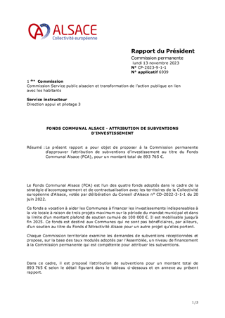 Le présent rapport a pour objet de proposer à la Commission permanente d'approuver l'attribution de subventions d'investissement au titre du Fonds Communal Alsace (FCA), pour un montant total de 893 765 €.