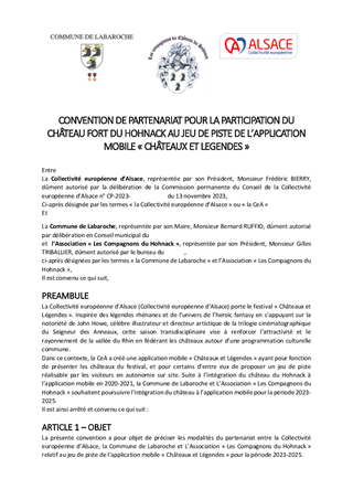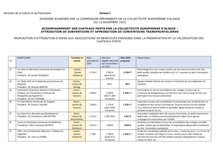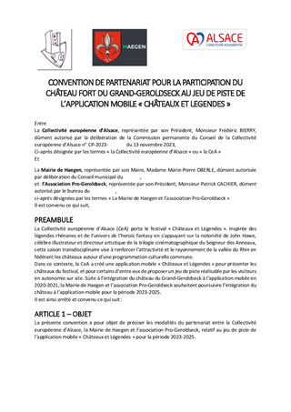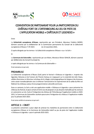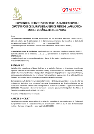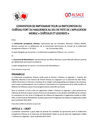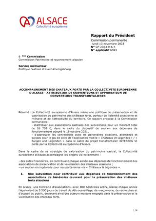 La Collectivité européenne d'Alsace mène une politique de préservation et de valorisation du patrimoine des châteaux forts, porteur de l'identité alsacienne et rhénane et de l'attractivité du territoire. Ce rapport propose à la Commission permanente : - d'attribuer aux associations castrales des subventions pour un montant total de 26 705 €, dans le cadre du dispositif de soutien aux dépenses de fonctionnement adopté le 18 octobre 2021, - d'approuver les conventions avec les partenaires alsaciens, allemands et suisses pour le jeu de piste de l’application mobile « Châteaux et Légendes » / « Burgen und Legenden » dans le cadre du projet transfrontalier INTERREG VI porté par la Collectivité européenne d'Alsace.