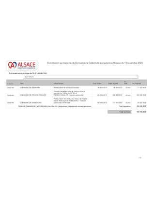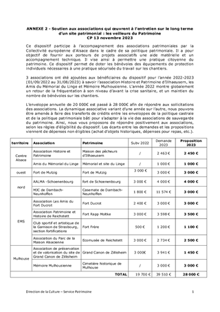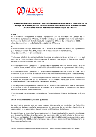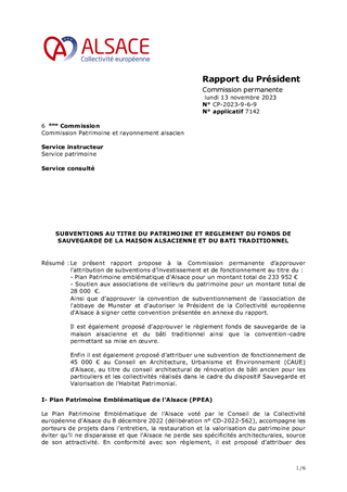 Le présent rapport propose à la Commission permanente d’approuver l’attribution de subventions d’investissement et de fonctionnement au titre du : - Plan Patrimoine emblématique d'Alsace pour un montant total de 233 952 € - Soutien aux associations de veilleurs du patrimoine pour un montant total de 28 000 €. Ainsi que d’approuver la convention de subventionnement de l'association de l'abbaye de Munster et d’autoriser le Président de la Collectivité européenne d'Alsace à signer cette convention présentée en annexe du rapport. Il est également proposé d'approuver le règlement fonds de sauvegarde de la maison alsacienne et du bâti traditionnel ainsi que la convention-cadre permettant sa mise en œuvre. Enfin il est également proposé d'attribuer une subvention de fonctionnement de 45 000 € au Conseil en Architecture, Urbanisme et Environnement (CAUE) d'Alsace, au titre du conseil architectural de rénovation de bâti ancien pour les particuliers et les collectivités réalisés dans le cadre du dispositif Sauvegarde et Valorisation de l'Habitat Patrimonial.