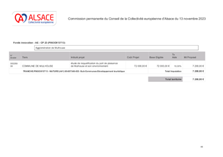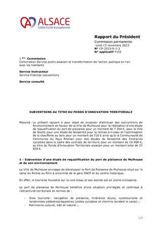 Le présent rapport a pour objet de proposer d'attribuer des subventions de fonctionnement en faveur de la Ville de Mulhouse pour la réalisation d'une étude de requalification du port de plaisance pour un montant de 7 200 €, pour la Ville de Soultz pour une étude de faisabilité pour la remise à niveau et l'optimisation de la chaufferie au bois pour un montant de 720 € ainsi qu'à la Communauté de Communes du Pays Rhénan pour des études de faisabilité des itinéraires cyclables dans le cadre des contrats de territoire pour un montant de 19 908 €, au titre du Fonds d'Innovation Territoriale alsacien pour un montant total de 27 828 €.
