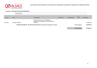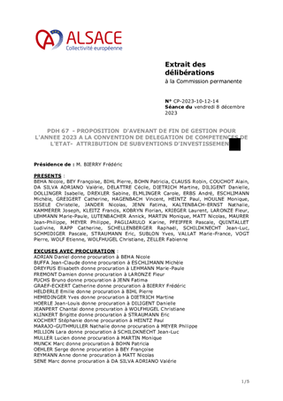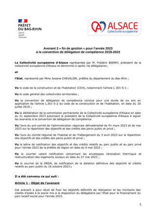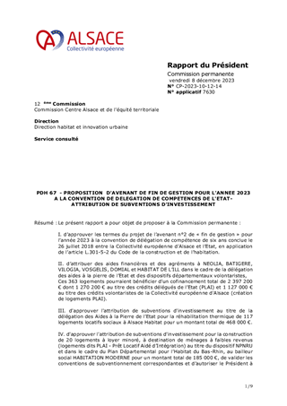 Le présent rapport a pour objet de proposer à la Commission permanente : I. d’approuver les termes du projet de l’avenant n°2 de « fin de gestion » pour l’année 2023 à la convention de délégation de compétence de six ans conclue le 26 juillet 2018 entre la Collectivité européenne d'Alsace et l’Etat, en application de l’article L.301-5-2 du Code de la construction et de l’habitation. II. d’attribuer des aides financières et des agréments à NEOLIA, BATIGERE, VILOGIA, VOSGELIS, DOMIAL et HABITAT DE L’ILL dans le cadre de la délégation des aides à la pierre de l’Etat et des dispositifs départementaux volontaristes, Ces 363 logements pourraient bénéficier d’un cofinancement total de 2 397 200 € dont 1 270 200 € au titre des crédits délégués de l’Etat (PLAI) et 1 127 000 € au titre des crédits volontaristes de la Collectivité européenne d'Alsace (création de logements PLAI). III. d'approuver l'attribution de subventions d'investissement au titre de la délégation des Aides à la Pierre de l’Etat pour la réhabilitation thermique de 117 logements locatifs sociaux à Alsace Habitat pour un montant total de 468 000 €. IV. d'approuver l'attribution de subventions d'investissement pour la construction de 20 logements à loyer minoré, à destination de ménages à faibles revenus (logements dits PLAI - Prêt Locatif Aidé d’Intégration) au titre du dispositif NPNRU et dans le cadre du Plan Départemental pour l’Habitat du Bas-Rhin, au bailleur social HABITATION MODERNE pour un montant total de 185 000 €, de valider les conventions de subventionnement correspondantes et d’autoriser le Président à les signer. V. d'approuver l'attribution de subventions d'investissement au titre du soutien à l'adaptation de 106 logements locatifs sociaux à la perte d'autonomie dans le cadre du Plan Départemental pour l’Habitat du Bas-Rhin, aux bailleurs sociaux LE FOYER DE LA BASSE BRUCHE, HABITAT DE L’ILL et ALSACE HABITAT pour un montant total de 322 908 €, de valider les conventions de subventionnement correspondantes et d’autoriser le Président à les signer.