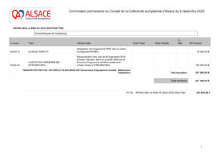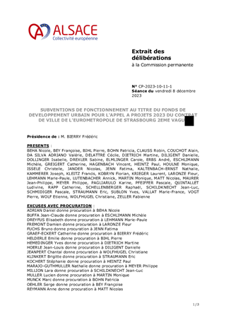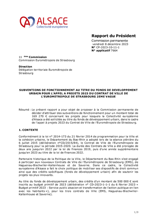 Le présent rapport a pour objet de proposer à la Commission permanente de décider d’attribuer des subventions de fonctionnement pour un montant total de 169 270 € concernant les projets pour lesquels la Collectivité européenne d'Alsace a été sollicitée au titre du fonds de développement urbain, dans le cadre de l'appel à projets 2023 du Contrat de Ville de l’Eurométropole de Strasbourg.
