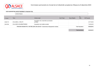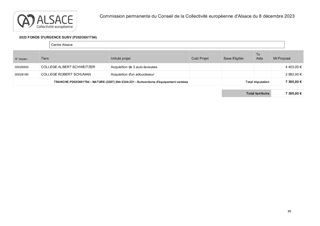 La Collectivité européenne d’Alsace a la charge des collèges publics. A ce titre, elle verse pour les dépenses de fonctionnement une dotation globale de fonctionnement (DGF) annuelle. En complément, elle a décidé de mettre en place, à partir de 2023, une dotation d’investissement, permettant le remplacement de mobilier, matériels et équipements. Le présent rapport propose à la Commission permanente d’attribuer des subventions d’investissement aux collèges publics alsaciens (acquisition de matériel sportif ou acquisition d'équipements divers), pour un montant total de 67 801 €.