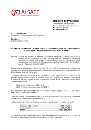 Il vous est proposé d’accorder la garantie d'emprunt à ALSACE HABITAT à hauteur de 100 % pour un prêt d’un montant total de 1 995 000 € à souscrire auprès de la Caisse des Dépôts et Consignations pour le financement d'une opération de construction de 16 logements locatifs sociaux situé « Le Clos Saint André » Rue Louis Klipfel à BARR.