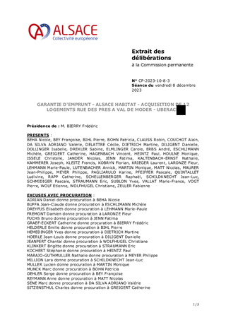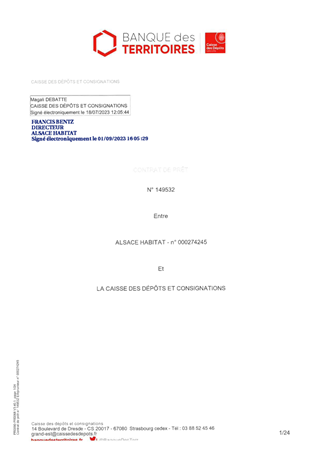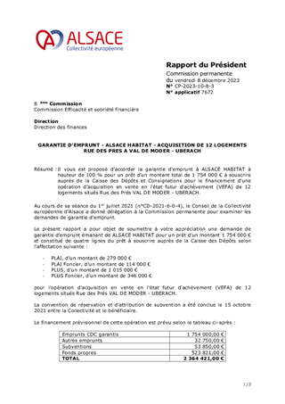 Il vous est proposé d’accorder la garantie d'emprunt à ALSACE HABITAT à hauteur de 100 % pour un prêt d’un montant total de 1 754 000 € à souscrire auprès de la Caisse des Dépôts et Consignations pour le financement d'une opération d’acquisition en vente en l'état futur d'achèvement (VEFA) de 12 logements situés Rue des Prés VAL DE MODER - UBERACH.