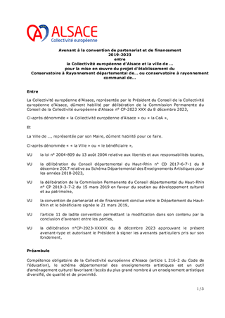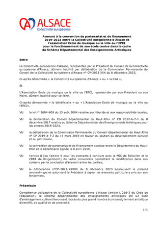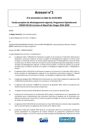 La plateforme mutualisée Alsace Marchés Publics est l’outil privilégié de plus de 560 acheteurs alsaciens. Lors de la Commission Permanente du 09 février 2023, les termes de la convention attributive d’une aide européenne FEDER relative au projet d’optimisation des services de collaboration à distance de la plateforme dématérialisée Alsace Marchés Publics a été approuvée. Il convient, par avenant, de corriger une erreur matérielle dans ladite convention produite par la Région Grand-Est, d'en approuver les termes et d'autoriser le Président de la Collectivité européenne d’Alsace à le signer. De plus, la plateforme mutualisée dénommée Alsace Marchés Publics repose sur un groupement de commandes dont la Collectivité européenne d'Alsace assure les fonctions de coordonnateur du groupement. Il s'agit d'approuver l'adhésion à ce groupement déjà constitué d'un nouveau membre contributeur par la conclusion d'un avenant à la convention constitutive du groupement signée le 14 septembre 2021.