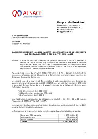 Il vous est proposé d’accorder la garantie d'emprunt à ALSACE HABITAT à hauteur de 100 % pour un prêt d’un montant total de 1 575 000 € à souscrire auprès de la Caisse des Dépôts et Consignations pour le financement d'une opération de construction de 13 logements situés 5 - 5A – 5B – 5C et 5D rue des Pâquerettes à OBERHOFFEN-SUR-MODER.